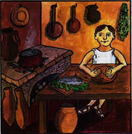 호라띠아는 로마의 소녀이다; 집에서 식사한다.
